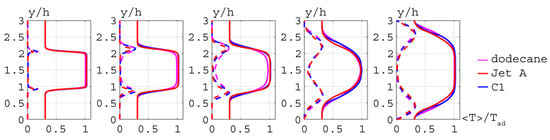 Figure 7 presents comparisons of the time-averaged temperature, , and temperature fluctuation, , profiles at , , , , and , normalized by the adiabatic flame temperature, , from the LES-LDKM-EDC simulations of n-dodecane, Jet A, and C1 at . Regarding , we find that, at , all fuels give virtually identical profiles. At the end of the recirculation zone, represented by , the profiles are still similar, with n-dodecane showing a slightly lower peak temperature. In the recovery region, here represented by the profile at , all profiles are wider and smoother, with that of n-dodecane being the widest and that of Jet A being the narrowest. In the fully developed turbulent combustion region, here represented by the profile at , the ordering is the same but the differences are now less pronounced. Regarding , we find very similar profiles between the fuels, with n-dodecane showing slightly higher values in the recirculation zone.