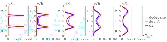 Figure 8 presents comparisons of the time-averaged CO concentrations, , profiles at , , , , and from the LES-LDKM-EDC simulations of n-dodecane, Jet A, and C1 at an equivalence ratio of . The profiles in the recirculation zone, represented by , , and , show some differences with the highest values occurring in the spatially developing shear layers for Jet A, followed by C1 and n-dodecane. In the fully developed turbulent combustion region, represented by , all profiles are virtually identical. The higher fluctuation levels (in and ) for dodecane and C1, compared to Jet A, are closely related to the higher pressure fluctuation levels observed also for dodecane and C1, which, in turn, are related to the differences in composition and chemistry of these fuels. This is also partly reflected in the different cetane numbers of these fuels.