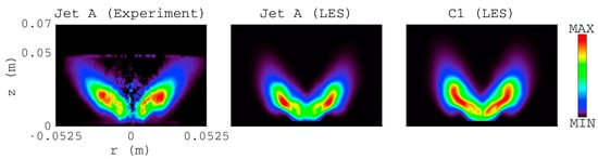A block-structured hexahedral mesh of 6.0 million cells is used to discretize the LES Equation (1). The cell size is roughly uniform throughout the domain, which means that the near-wall flow behavior has to be accounted for by a wall model based on Spalding’s law of the wall []. Approximately 85% of the total turbulent kinetic energy belongs to the resolved scales, on average. The mass flux at the air inlets is fixed, and the fuel injection ring is treated as a wall for the Eulerian phase. A wave-transmissive boundary condition is used at the outlet, which allows the pressure to be controlled but avoids unphysical wave reflection. All walls are considered adiabatic. Following (2), Lagrangian particles, representing groups of fuel droplets, are introduced uniformly along the injection ring, with diameters chosen randomly following a Rosin–Rammler probability distribution, as described in []. Simulations are initialized from a simple state where the combustion chamber is filled with burnt gas, after which they are run until a statistically steady state is achieved. Temporal averages are constructed over 10 ms. Figure 10 presents the time-averaged flame shapes based on heat release rate (simulations) and deconvoluted OH* chemiluminescence (experiments). The simulated flames for both Jet A and C1 are qualitatively similar to experimental observations. The heat release is spread out along the inner shear layer in the C1 flame, while it is more concentrated around mm in both the experiments and the simulated Jet A flame. The closer resemblance of Jet A to the experiments is expected as a conventional jet fuel was used in the experiments.