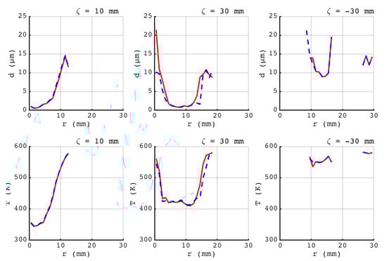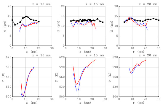 Radial distributions of time-averaged diameter (top) and temperature (bottom) at three different axial locations. Experimental data from []. Legend: experiment (