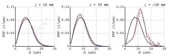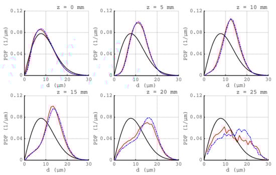Probability density functions (PDF) of droplet diameter in six planes downstream of the burner. Black: PDF at injection. Legend: PDF at injection (