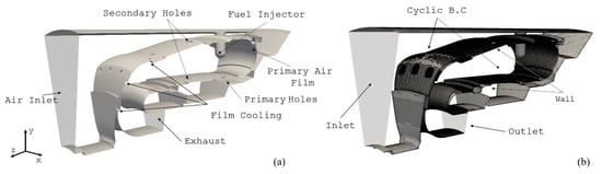 The computational domain of the third case here presented is represented by a ~26° sector of an annular reverse flow combustor inspired by the PT6C turboprop engine liner, often used for helicopters, such as the Augusta Westland 139 used by the Swedish Maritime Administration Search and Rescue. The selection of this specific geometrical configuration aims to eliminate the prospect of capturing thermoacoustic instabilities, which is out of the scope of this study. The liquid fuel is injected in the combustor, forming an injection angle of ~30° with respect to the -axis, Figure 14a. The diameter of the droplets is based on the Rosin–Rammler distribution []. After the droplet vaporization, the gaseous fuel mixes with air and the resulting mixture starts to react in the primary sector of the combustor enclosed by the inner end wall and the dilution holes, Figure 14a. Within this combustor section, air is fed through a primary air film behind the injector, and primary holes at the lower wall of the combustor. Since the aim of this design is to decrease the pressure and increase the air flow velocity, as well as to reduce temperature and, consequently, the NOX production [,], optimal combustion is achieved in two stages. Hence, additional air enters the combustor through dilution jets (secondary holes in Figure 14a) and cooling films located at the inner wall on the return bend of the combustor. Here, LES-LDKM-EDC is performed on unstructured grids with ~5 million cells for both Jet A and C1 to characterize the differences between fossil and non-fossil fuels. Grids are clustered around primary and dilution holes, as well as inside the liner, with particular attention devoted to the grid size in the vicinity of the liner walls. As a result, on average, approximately 75% of the total turbulent kinetic energy belongs to the resolved scales. This fraction should typically be higher in LES, but it should be noted that it is brought down substantially by the large coarse-grained regions far from the region of interest, near the spray and flame. In said region of interest, over 99% of the turbulent kinetic energy is resolved. A projection of the baseline mesh on the wall and an outline of the domain is presented in Figure 14b.