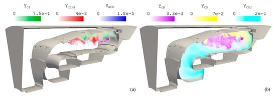 Figure 15a presents instantaneous volumetric renderings of the temperature, T, for C1. The inlet air enters from the back of the liner through the multiple holes, allowing the spray to vaporize and the gaseous fuel to mix with the air. A volumetric rendering of the temperature field suggests that the combustion process mainly occurs between the primary and secondary air holes, the role of which is to create a high-strain region inside the liner able (i) to recirculate fuel and air, as well as hot radicals, and (ii) to stabilize the flame. Similar behavior has been shown on a similar architecture studied by Boudier et al. []. Furthermore, the extra air entrainment into the liner through the cooling air films and holes drastically reduces the combustion products’ temperature, confining the hot gases at the inner part of the liner. Figure 15b presents the overall functioning of the chamber through an instantaneous perspective view of the velocity magnitude, U, on a lateral patch, the projection of the temperature, T, on the outlet, the C1 Lagrangian field colored in magenta, and a volumetric rendering of heat release rate, . Concerning the projection of the velocity field, it is visible how the mesh resolution captures the flow structures formed by the spreading of fresh air in the inner combustion chamber well, highlighting the complexity of the resulting flow field. The fuel droplet locations, as well as the distribution of the rate of heat release, suggest that the liquid fuel evaporates mainly through interaction with the air coming from the primary film and primary holes, while the combustion process proceeds in the region between the primary and the secondary holes. The reacting mixture and combustion products are accelerated toward the outlet by the reversed combustor configuration. The temperature at the outlet also shows the effect of the cooling films shielding the liner from the hot combustion products.