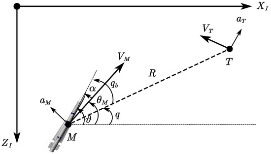 where R is the relative distance between a maneuver target and the missile, q is the angle of line-of-sight (LOS), and , represent the angle of attack and the pitch rate, respectively. The velocities of the missile and the target and are assumed to be constant. The terms and are their flight path angles. Additionally, m denotes the mass of the missile, and is the moment of inertia around the z-axis.