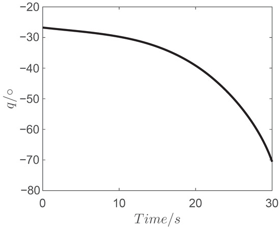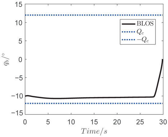 For the strap-down hypersonic vehicle, the optical axis of the seeker is connected fixedly with the vehicle’s body, and the BLOS angle should be strictly limited in the range of the seeker’s effective field of view, which can be represented as , where and denote the lower and upper limitations of the BLOS, respectively. During the final phase of the engagement, the BLOS constraint should always be met, and its representation is obtained by the following relationship: