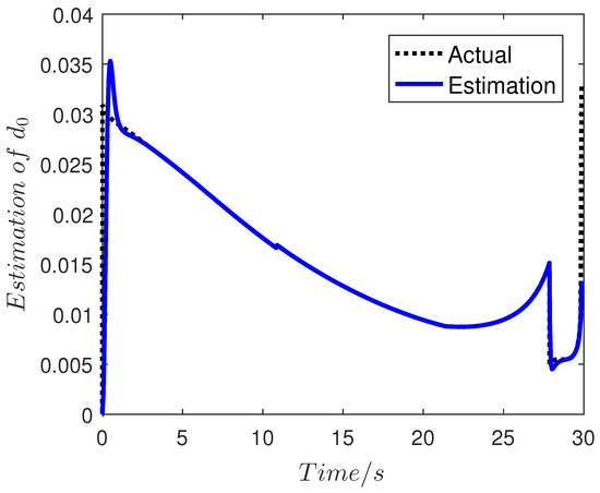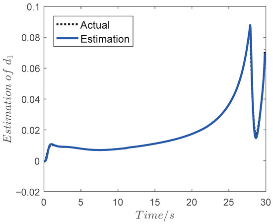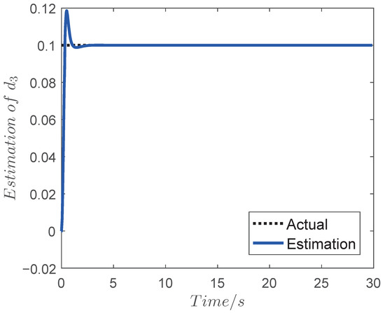 The simulation results are shown in Figure 4, Figure 5, Figure 6, Figure 7, Figure 8, Figure 9 and Figure 10 and the estimations of the disturbances are shown in Figure 11, Figure 12 and Figure 13. As seen in Figure 4 and Figure 5, the final miss of distance is small, which means that the fine engagement has been achieved by the proposed IGC law in (32). Moreover, the BLOS angle is constrained in the prescribed FOV limitations, which shows that the FOV constraint is not violated in the flight procedure. The angle of attack , pitch rate and evaluator are shown in Figure 8, Figure 9 and Figure 10. Meanwhile, the estimation of the uncertainties in Figure 11, Figure 12 and Figure 13 demonstrates that the proposed OFTDO has achieved the finite-time estimation of the unknown unmatched uncertainties successfully.