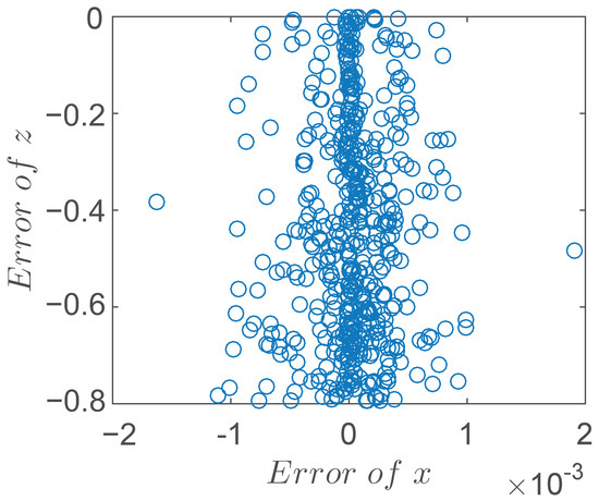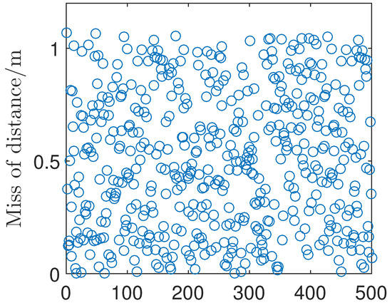 To further test the robustness and effectiveness of the proposed IGC law, Monte-Carlo tests were carried out in the simulation. The number of the tests was set as 500 times, and the final location on the x and z axes and the missed distance are shown in Figure 14 and Figure 15, respectively. The mean and the standard deviation can be calculated as 0.501 m and 0.7741 m, respectively. As seen in these figures, the distribution of the missed distance is smaller than 1 m, which shows the strong robustness of the proposed IGC law.