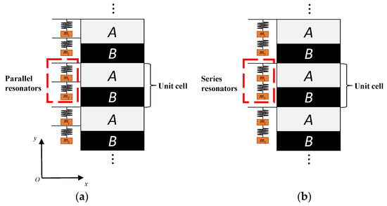 Configuration diagrams of the infinite struts with local resonators: (a) parallel resonators (b) series resonators.