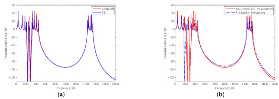 Transmission capability of struts: (a) obtained by proposed method and finite element software (b) with two parallel resonators and a single resonator.