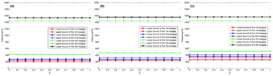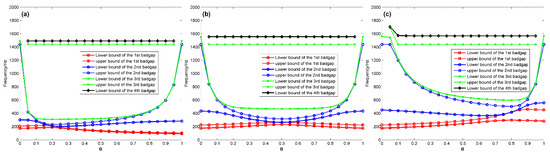 Lower and upper borders of the bandgaps for the infinite coupling strut: (a) as a function of when and ; (b) as a function of when and ; (c) as a function of when and .
