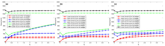 Next, the band diagrams are displayed in Figure 7 and Figure 8, where the variation of bandgap boundaries taking and as the independent variable, respectively. The boundaries of the first to fourth stopbands are also signed by red, blue, green and black symbols, respectively.