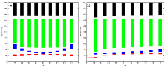 Under the same theoretical model and parameter environment as Figure 7b, the overlapping and broadening of band gaps after using graded mass ratio is studied. The total bandgap of a graded designed structure is actually the union of the upper and lower bandgaps of each graded unit. In order to more intuitively judge whether the band gaps generated by graded overlap with another, the distributions of the first to fourth band gaps are represented by red, blue, green and black bars in Figure 9a. As depicted in Figure 9a, the mass ratio lying in the intervals of would create a broad overall bandwidth, whose range is 176–1439 Hz. Similarly, following the theoretical model in Figure 8b, it is evident from Figure 9b that a broad overall bandwidth within the range of 130–1439 Hz would be generated when lying in the intervals of . In addition, the passband between the third bandgap and the fourth bandgap always exists and is hardly affected by the resonator parameters.