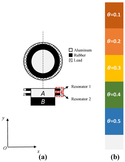 In this subsection, a finite coupling periodic strut is designed to verify the theoretical calculation results of the method presented in this paper. The results obtained by the present method are compared with those obtained by the finite element software. The typical Bragg strut studied in [17,26] is taken as the prototype model, and five groups of parallel resonators are added to the strut. The simplified diagram of the finite coupling strut is given in Figure 4. The proposed coupling strut is composed of five identical unit cells, and every cell is made up of an aluminum layer carrying two parallel resonators and a rubber layer. An aluminum layer is added to the bottom of the strut for ease of installation. A ring-shaped rubber layer and a ring-shaped lead block comprise the resonator. In the simulation analysis, the input excitation is applied at the center point of the top aluminum layer, and the output signal is measured at the center point of the bottom aluminum layer. The boundary conditions at both ends of the strut are free, and the transmissibility is defined as