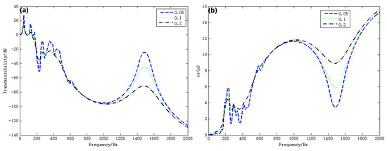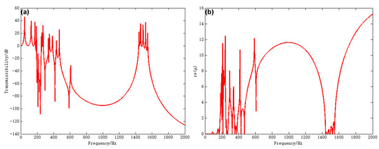 The vibration transmittance of the reverse designed strut and the corresponding attenuation constant curve are depicted in Figure 11a,b. The transmissibility of the designed strut shows the same trend of change as the attenuation constant of the corresponding supercell. It can be known from Figure 11 that the starting frequency of the vibration attenuation for the reverse designed strut is reduced to 187 Hz, which is very close to the 176 Hz predicted by the infinite strut. However, the broad coupling bandgap is not generated because the finite strut fails to satisfy the ideal periodic conditions, resulting that several resonance peaks still exist in the range of 200–500 Hz. It is worth mentioning that the results above are obtained in the absence of any damping of the structure and resonators. In vibration and noise control engineering, damping is often used to suppress the peaks of the vibration response. Thus, the damping of structure and resonators is introduced to further improve the vibration attenuation performance of the strut.