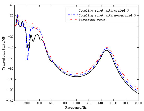 The frequency range of vibration attenuation for the coupling strut with graded is 152–2000 Hz, and the performance of vibration attenuation for the prototype strut starts at 307 Hz and ends at 2000 Hz. The coupling strut with graded design broadens the width of attenuation gap below 500 Hz by 155 Hz. Additionally, in the range of 152 Hz to 500 Hz, the proposed strut has better performance on vibration attenuation than the prototype one. The absolute value of the difference between the transmissibility of the two struts even reaches 43.25 dB at 226 Hz. The proposed strut not only has advantages on the band widening and vibration attenuation below 500 Hz, but also performs better than the prototype strut in the range of 500 Hz to 2000 Hz. The vibration transmissibility of the proposed strut decreases by up to 8.9 dB over the prototype strut at 2000 Hz. As the curves suggest, vibration transmission in the range of 0 Hz to 2000 Hz is substantially reduced by the graded design.