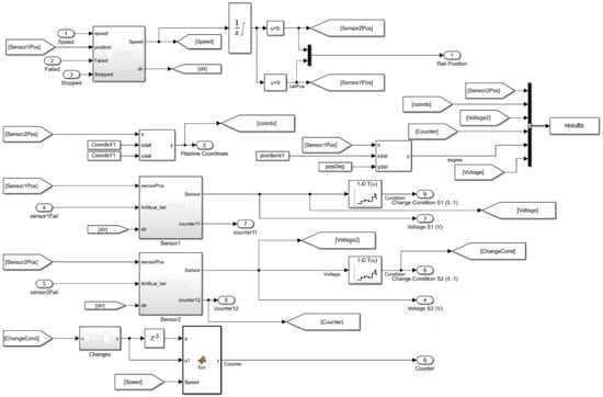 The modeling scheme consisted of two blocks imitating the “measuring bar—IPS” system of one edge of the mechanization section, a built-in section skew control block, and a model control panel. The modeling scheme of the “measuring bar—IPS” system is shown in Figure 2. This block simulated the movement of the measuring bar relative to the IPS. When controlling the stand through a model, these blocks imitated the IPS readings when moving along a given measuring bar.