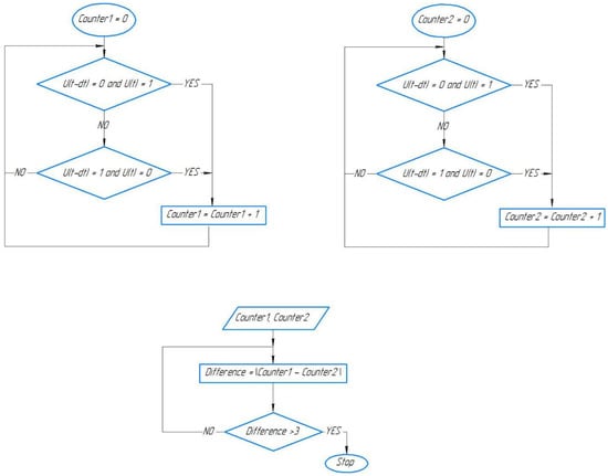 The algorithm for determining the skew by the counter consisted of counting the number of signal changes (from 0 to 1 or from 1 to 0) obtained when the IPS moved relative to the measuring bar. Section misalignment was therefore detected if the switch counters monitoring the movement on the two rails within one section differed by three counts corresponding to the sensor passing opposite one mark and trough within 0.3 s. The block diagram of the algorithm’s operation with the counter is shown in Figure 3, where U is the signal from the sensor.