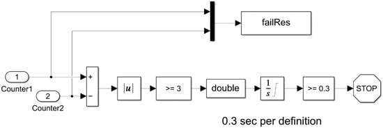 The simulation diagram (Figure 4) compares the difference between the counter values of the number of switching operations of the IPS (from 0 to 1 or from 1 to 0) controlling the two measuring bars. The counter values must not differ by more than three tap-change operations. If the counters for changing the IPS signal from two bars diverge by more than 3, a stop signal was sent, which went through the delay unit for 0.3 s.