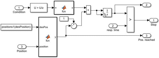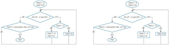 The block diagram (Figure 5) checks each cycle of the system to see if the IPS signal has changed. If the IPS signal changed from 0 to 1, provided the timer had not been started, the timer is started. If the timer has already been started, it was reset and started again. If the IPS signal did not change, the timer continued to count until it reached the calculated time of one lap and one interval, increased by 0.5 s. When this value was reached, the skew was detected. Figure 6 shows the simulation of timer 1 in MATLAB Simulink. The simulation of timer 1 was performed when implementing a time algorithm taking into account the signal from one sensor.