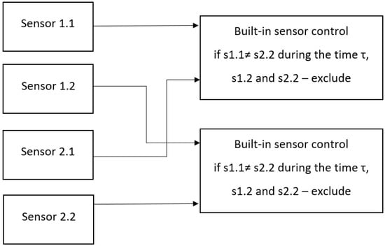 The principle of operation of the built-in control consisted of a pairwise comparison between the signals of the sensors opposite one rail and the signals of the IPS opposite those sensors. In the event of a discrepancy between readings for a certain time, a pair of sensors was considered faulty, and the signals from these IPS were excluded from the system. The block diagram of the built-in IPS control algorithm is shown in Figure 7.