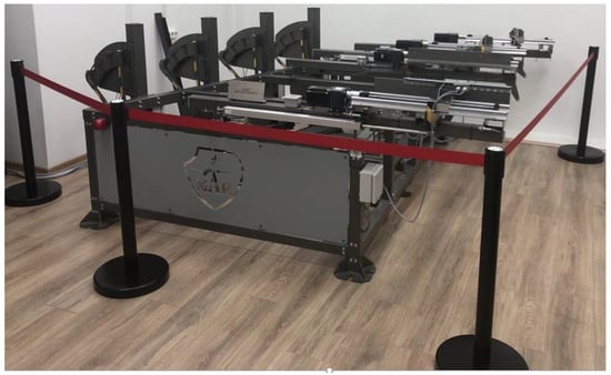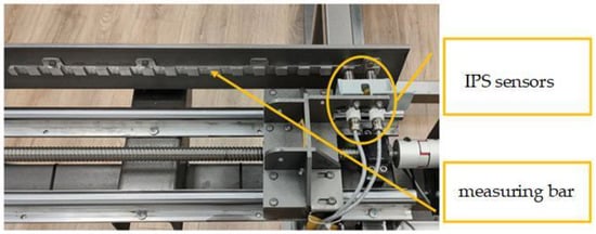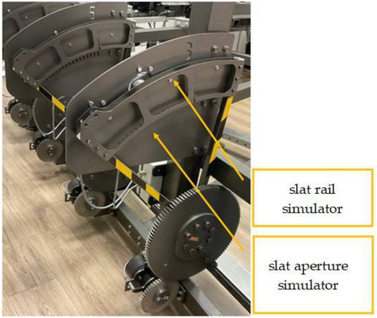 The stand was an automated complex for full-scale simulation of the operation of the SCS. The stand was based on a metal frame that replicated the shape of an aircraft wing part, on which eight simulators were fixed (4 flap simulators—Figure 9 and Figure 10, and 4 slats simulators—Figure 11 and Figure 12). In the slider simulator, the slat was attached to the rail simulator, and IPS was attached to the aperture simulator. The bar moved relative to the fixed sensors during the slat extending/retracting process. In the flap simulator, the bar was installed on the rail simulator, and the sensors were on the carriage simulator. During flap extending/retracting, the sensors moved along the fixed bar. In the event of a skew, the slat rail or flap carriage, fixed on one of the edges of the mechanization section, stopped while the mechanization section fixed on the other edge continued to move.