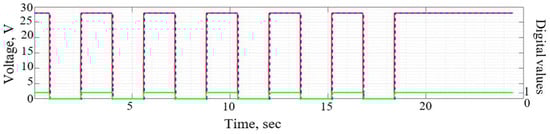 Test results: red graph—IPS readings according to the mathematical model; blue—real sensor readings; green—calculated numerical values of IPS readings (1 corresponds to high voltage, 0 is to low voltage), embedded in the mathematical model, determined by the geometry of the measuring bar and the speed of IPS sensors relative to the bar.