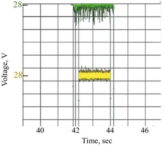 Figure 14 shows the data obtained from the oscilloscope during the passage opposite the signal mark of two IPSs installed at different frontal distances (2.5 mm and 3.5 mm). For clarity, the graphs have been spaced along the voltage axis. The green graph takes on a high level earlier since the sensing element is located closer to the mark. In this system, all sensors were set at a frontal distance of 3 mm with a tolerance of +/− 0.1 mm. In addition, the actual output characteristics of the IPS sensors may vary slightly within the same batch. It was decided not to consider the obtained hysteresis of the sensors in the model. Since its value is small and can vary from sensor to sensor, the developed algorithms exclude the influence of the switching delay on system performance.