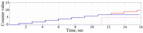 An example of the operation of the skew detection algorithm with a counter: blue is the value of the counter that controls the readings of the IPS opposite rail 1, red is the value of the counter that controls the readings of the IPS opposite rail 2, and pink is the time the failure was introduced into the system.