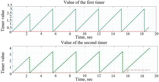 An example of the operation of the algorithm for determining the time skew: blue is the value of the timer that controls the first rail, green is the value of the timer that controls the second rail, and red is the time the failure was introduced into the system.