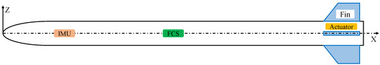 A schematic representation of the slender vehicle studied in this paper is shown in Figure 4. The X axis is directed backward along the centerline of the body. The Z axis is vertically upward, and the Y axis is determined by the right-hand rule. The aerodynamic surface comprises the body and fins. The IMU collects the vibrational response of the body, and the FCS calculates the control command to drive the actuators. The vehicle is divided into aerodynamic grids, with on the body (subscript ) and on the fins (subscript ). The excitation points and measurement points are also divided between the body ( and ) and fins ( and ). The ASE system is established by one of the roll, pitch, or yaw channels, i.e., and .