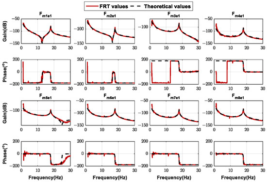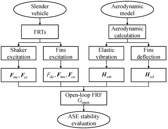 As shown in the flow chart in Figure 9, the FRFs of the structure and servo control systems acquired from the FRT (Equations (10) and (11)) and those of the unsteady aerodynamic forces (Equations (16) and (25)) are introduced into Equation (9). The ASE open-loop FRF is expressed as