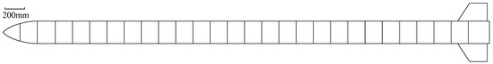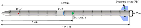In order to verify the feasibility and accuracy of the proposed method, a slender vehicle with an FCS was designed and manufactured. As shown in Figure 10, the body is composed of 14 cylindrical aluminum compartments, which are connected by steel counterweights. Only the horizontal fins were designed, and an ASE stability evaluation of the pitch channel is carried out. The FCS and actuators are located inside the body, and the IMU located on the upper surface. The measured mass is 310.6 kg, and the pitching moment of inertia is 652.0 kg.m2. The modal parameters of the slender vehicle are obtained through GVTs, using an LMS SCADAS data acquisition system and LMS Test Lab software [33]. The PolyMAX method is used for modal parameter identification. A spring hanging support is used to realize the free–free boundary conditions, for which the pitch and plunge frequencies are 1.10 Hz and 1.30 Hz, respectively, with damping ratios of 6.0% and 3.0%, respectively. The measured mode frequencies of the first and second bending modes are 18.0 Hz and 50.2 Hz, respectively, with damping ratios of 0.45% and 0.55%, respectively.