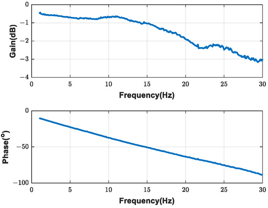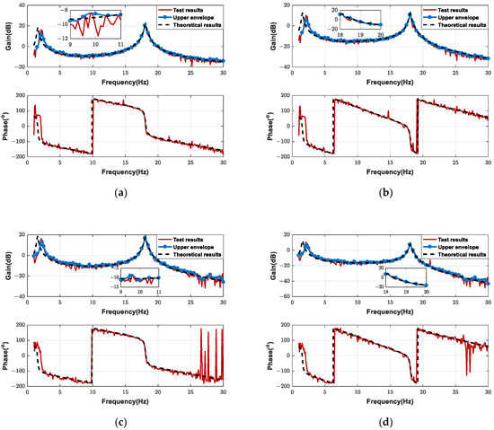 Comparisons between the test results and the theoretical results are shown in Figure 24. Local enlargements of the gain curves near the phase crossover frequency are shown in the insets. It can be seen that the test curves are in good agreement with the theoretical curves in most frequency ranges. The test curve fluctuates significantly, owing to noisy interference, so it is difficult to accurately judge the gain margin. Therefore, it is preferable to use the upper envelope.