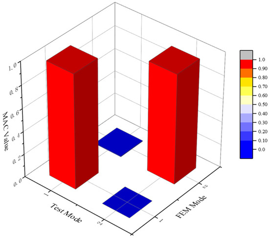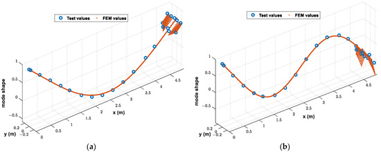 The higher-order modes beyond the frequency range of interest are difficult to identify from the test data, but they can be approximated using the FEM model and introduced as higher-order residuals. For the hanging-mode term, the mass, inertia, hanging stiffness, and hanging damping measured in the test and the rigid-body modes are brought into Equation (32) to calculate the coefficients , , , and . This can be written as