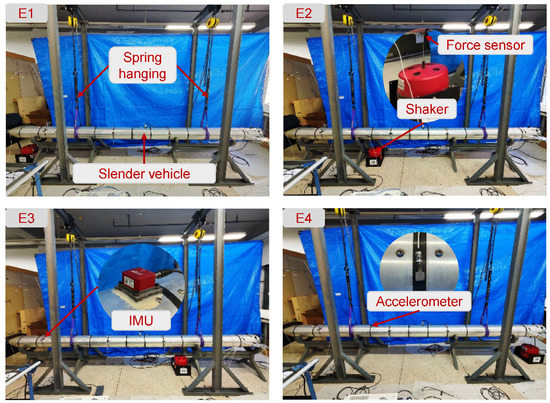 The FRT for slender vehicles described in this paper includes an independently implemented shaker excitation test and a fin excitation test, as shown in Figure 5. In general, the FRT is conducted with free–free boundary conditions using hanging supports, the stiffness of which is adjusted such that hanging-mode frequencies are kept far below the first elastic mode. The shaker needs to apply excitation separately at each excitation point in the single-input and multi-output (SIMO) shaker excitation test. The fins are deflected for excitation in the fin excitation test, which is also a SIMO test. Vibration sensors are used to collect the displacement signals or acceleration signals of the measurement points. Force sensors are used to collect the force signals in the shaker excitation test. The FCS command signals and the fin deflection response signals must also be collected.