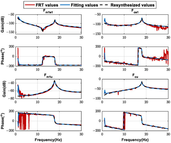 Taking a group of test data for the four types in Equation (33) as an example, the fitting and resynthesized results are shown in Figure 27, where fitting values are the results with hanging modes, and the resynthesized values are the results after removal of the hanging modes. It can be seen that the fitting values are in good agreement with the test values, which shows the accuracy of the fitting.