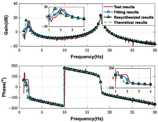 Taking a group of test data of the U1C1 state as an example, the proposed method is used to fit and resynthesize the experimental FRFs, and the ASE open-loop FRF is obtained at Ma = 1.5, as shown in Figure 28. It can be seen that in the frequency range not affected by hanging modes, the fitting results and resynthesized results are in good agreement with the test results. In the frequency range affected by the hanging modes, the fitting results are in good agreement with the test results, which include the hanging modes, whereas the resynthesized results are in good agreement with the theoretical results, which are established with free–free boundary conditions. The gain margin and phase margin are listed in Table 4. For the phase margin, the resynthesized results are more consistent with the theoretical results than the test results and the fitting results, and the deviation of the phase margin from the theoretical results is reduced from 6.5° (test results) to 0.15° (resynthesized results). The data processing results show that the proposed FRF fitting and resynthesis method can effectively remove the hanging modes and obtain the ASE open-loop FRF with free–free boundary conditions.