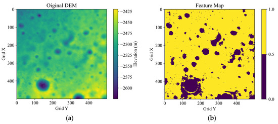 . It can be seen that the feature map, with consideration of the topography and illumination traversability, conveys the obstacle areas in a more distinguishable way than the original DEM.