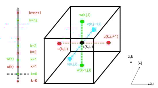 In PALM, the calculation domain is discretized by using finite differences and equidistant horizontal grid spacings . By default, the model uses constant grid spacing  along the z-direction, but it can be stretched in the vertical direction to save computational time in the free atmosphere. In our application of simulating general airplane flights over a mountainous region, we focused on a limited height range from about  to less than  above mean sea level (AMSL). The existing computing resources allowed us to conduct the simulations with fine grid spacings in vertical direction. Hence, we kept the default setting with a constant grid spacing. PALM uses a C-grid topology called Arakawa staggered C-grid defined in [,]. By definition of the Arakawa staggered C-grid, all scalar variables s, e.g., the perturbation pressure , SGS-TKE e, SGS eddy diffusivities of momentum  and heat  etc., locate at the cell centres, while the vector variables, respectively the wind components  are shifted by half of the grid spacing to the face centres (see Figure 1). In the vertical direction, the first w-component  indicates the bottom boundary at the surface height and the last w-component  defines the top boundary. The first grid point for scalars s and horizontal wind components  locates half grid spacing  under the surface. However, this point is just declared in the array but practically not required for the calculation. At the top boundary, the last grid point  of  is  above .