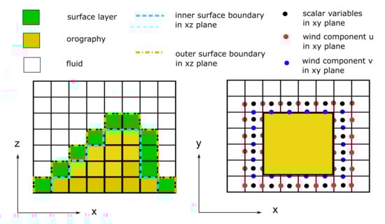 A sketch of the topography implementation is presented Figure 2. For fluid cells, the normal PALM code is executed. In the region between inner and outer surface boundaries, wall functions are applied to the surface layer. We used Neumann no-slip condition combined with Monin-Obukhov similarity theory (MOST) that assumes a constant flux layer between inner surface boundary  and  (the first computing grid point at cell centre for horizontal wind components and scalars). When considering the yellow solid cells, the PALM standard code is executed but multiplied by zero. Note that the surface on solid cells on the horizontal plane is defined by the location on wall-normal velocity, respectively on grid cell surfaces. Furthermore, the grid cells surrounded by three or more walls are filled by the lowest height of neighbouring grid cells. This filtering function aims to avoid the case that a single surface layer cell is surrounded by three or more solid cells, where numerical instabilities could occur.