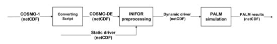 Figure 3 presents the workflow of using the mesoscale nesting interface INIFOR for a PALM simulation. INIFOR has been developed mainly by the German Meteorological Service (DWD) and is currently designed to process the output data of DWD’s operational configuration COSMO-D2 and its predecessor COSMO-DE []. Due to the slight difference between COSMO-1 and COSMOS-D2/DE data in coordinate system, COSMO-1 reanalysis data is to be converted in a conform form prior to importing into the nesting interface. INIFOR reads COSMO data and a static drive file containing topography information, and forces interpolated COSMO data in a rotated-pole system onto PALM’s Cartesian grid. INIFOR generates a dynamic driver file as output. The dynamic driver file is required by PALM as simulation input, when enabling the mode mesoscale nesting, so called “offline-nesting” in PALM model system.