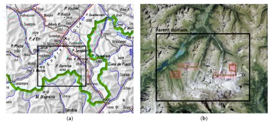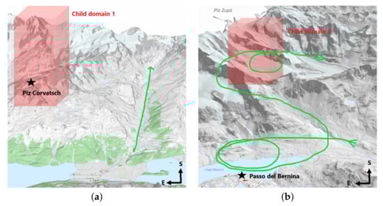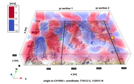 The non-hydrostatic model COSMO is used operationally all around the globe, however with a strong focus on Germany and Switzerland. There, the COSMO model is run in different resolutions, where the highest resolution currently used Switzerland is of  (COSMO-1:  N-S and  E-W) and spreads over 80 vertical coordinate levels in a smooth level vertical (SLEVE) terrain-following coordinate []. The COSMO-1 reanalysis (historic) data is available in hourly resolution on-demand and was ordered from the Federal Office of Meteorology and Climatology in Switzerland (MeteoSwiss) for the present study.