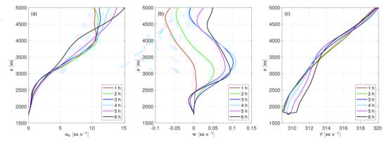 Horizontal mean vertical profiles of (a) horizontal wind speed, (b) vertical wind speed and (c) potential temperature at the whole domain in time after the start of the simulation at 06:00 UTC.