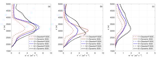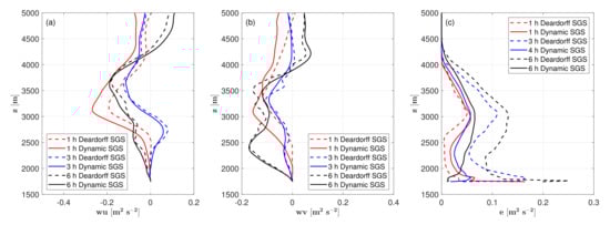The default SGS model in PALM follows a 1.5-order closure approach suggested by Deardorff []. The modified version of [,] was implemented in PALM. The closure assumes that the SGS terms presenting energy transport by SGS eddies are proportional to the local gradients of the considered variables and read as
