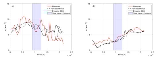 In Deardorff’s model,  in Equation (44) is considered as constant which actually varies flow types. The model with constant  overestimates the velocity shear in the near wall region, particularly if the grid resolution is not sufficiently fine. To overcome these deficiencies, many research were carried out in the 1980s to develop dynamic SGS models whereby  varies spatially and temporally. By describing the dynamic SGS model implemented in PALM, the  is written as  and the l in Equation (44) is replaced by the symbol . As a pioneer study on developing dynamic SGS, Germano et al. [] introduced a test filter  and the Germano identity  defined as