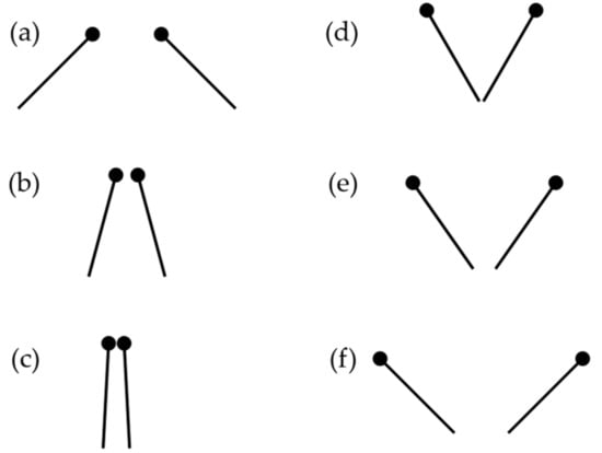 The clap-and-fling mechanism was first reported by Weis-Fogh in 1973 to explain the lift enhancement in hovering tiny wasp (Encarsia Formosa) []. The clap-and-fling, as the name states, consists of two phases: “clap” and “fling” (Figure 1). During “clap” (Figure 1a–c), the wing pair move toward each other, and their leading edges touch at the end of a half stroke. Following “clap”, the leading edges separate and the wing pair “fling” apart (Figure 1d–f). This motion was found in many insects such as whitefly [], thrips [], butterflies [], and diptera []. For insects with flexible wings, such as and locusts [], Drosophila [], mantis [], clap-and-fling is renamed as “clap-and-peel” because of a similar manner to a “peel” during “fling” motion []. Another variation of “clap-and-fling” is “near-clap-and-fling”, in which the wing pair only press close to each other but do not touch. This pattern was observed in flour moths (Ephista) [], bluebottles (Calliphora vicina) [], and white butterflies (Pieris barssicae) [].