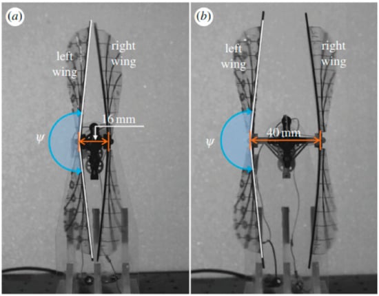 Because the flapping mechanisms were described in detail in previous work [], we just briefly explain them here. As shown in Figure 2, the flapping system in KU-Beetle includes four-bar linkage and pulley-string mechanisms. As shown in Figure 3a, this combination enables a large flapping amplitude (Ψ) of more than 180°, allowing the wing pair to press close to each other at each half stroke and thus taking advantage of the clap-and-fling effect. The strength of the clap-and-fling effect depends on wing distance—the distance between two wings’ pivot points, denoted by d. As in previous work, two wing distances were investigated: 16 mm (0.64cm) in which the clap-and-fling effect was strong, and 40 mm (1.6cm) in which the clap-and-fling effect was almost diminished (Figure 3).