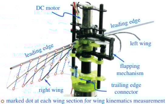 The wing veins were made of carbon strips and the wing membranes were made of polyethylene terephthalate (Figure 4). The wing length from the root to tip (R) was 70 mm. The mean chord (cm) was 25 mm. Each wing’s membrane rotates around a carbon rod attached at the leading edge. The trailing edge at the wing root was connected to the trailing edge connector. These configurations allow the wings to perform span-wise twist and chord-wise camber during the flapping motion.