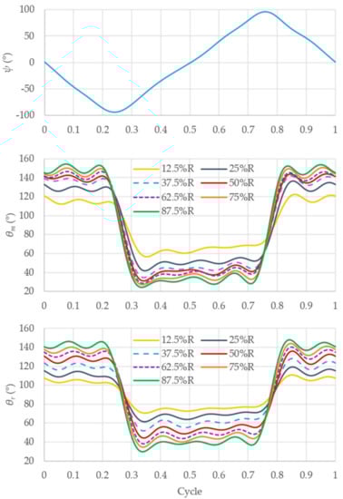 The parameters defining the wing kinematics were explained in Ref. []. The wing pitches around a feather axis which instantaneously revolves around a flapping axis (Figure 5a). In KU-Beetle, the feather axis is located at the leading edge of the wing. The flapping angle (ψ) between the feather axis and the mid-stroke plane—the plane perpendicular to the longitudinal symmetrical plane of the FW-MAV—determines the position of the feather axis. The camber of each wing section was modeled as a parabolic curve. Its orientation and shape were determined by two parameters: the mid-chord angle (θm) and the full-chord angle (θr) (Figure 5b). In order to measure ψ, θm and θr for various span-wise positions, the three-dimensional wing motion of KU-Beetle was captured using three synchronized hi-speed cameras. Then, the measured data was fitted by sum of sinusoidal functions. These processes were detailed in Refs. [,,]. The time-courses of ψ, θm and θr are shown in Figure 6.