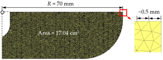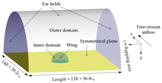 The CFD model was computed by the commercial software of ANSYS Fluent 16.2. Similar modelling technique as in Ref. [], which was proven to provide converged solutions [,], was employed. Due to symmetry between the left and right wings, the CFD model was built for only left wing. Hence, the computational domain was a half cylinder whose length and diameter were of 13 and 14 times the wing length (36.4cm and 39.2cm), respectively. The symmetrical plane modeled the longitudinal mid-plane of the FW-MAV. With “symmetry” boundary type assigned to the plane, the wing–wing interaction between the left and right wings can be simulated. A significant difference from the previous work is that in this work, the volume inside the computational domain was divided into two parts: the inner domain containing the wing and the outer domain (Figure 7). The radius of the inner domain was 1.16 times the wing length.